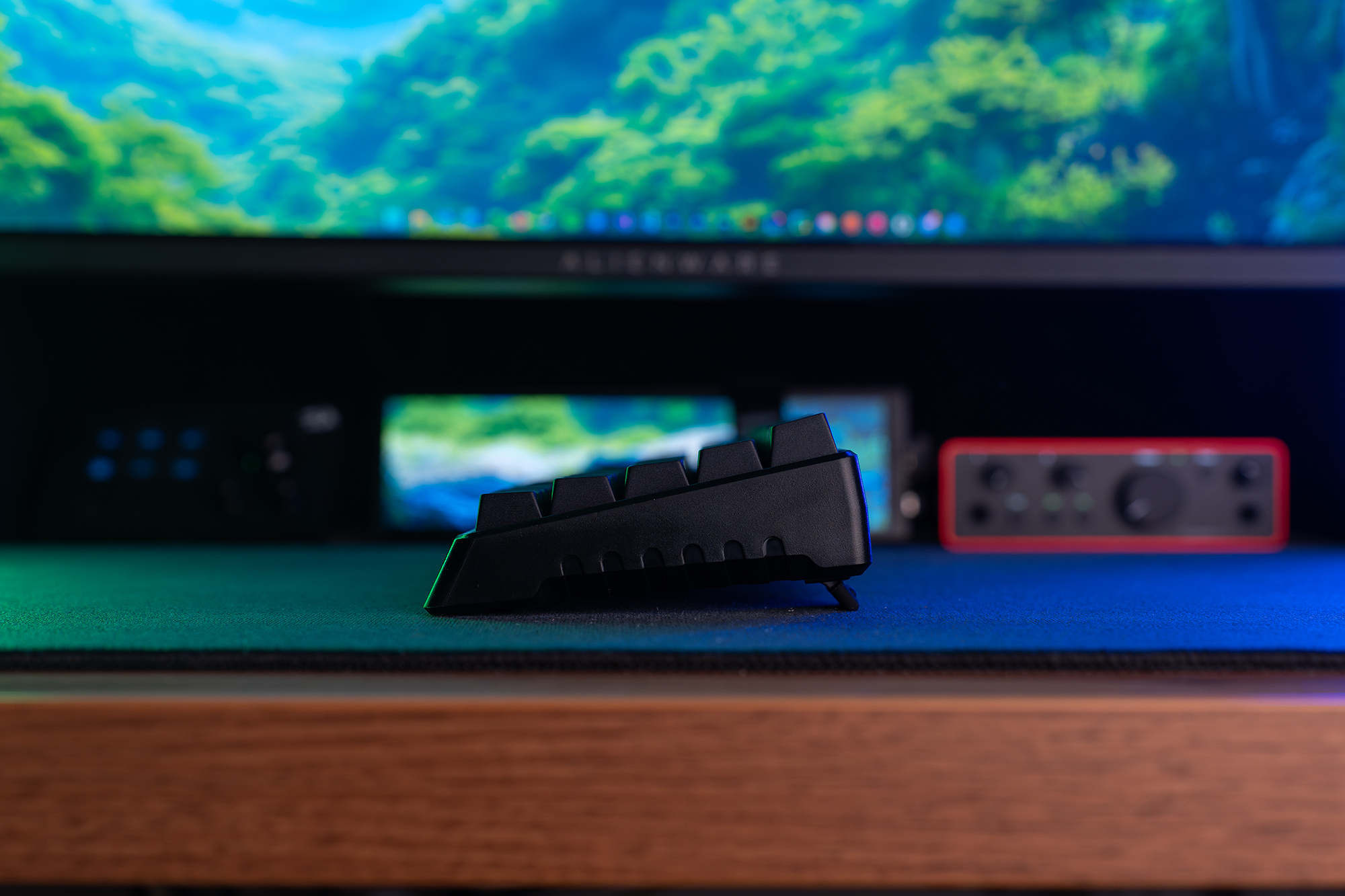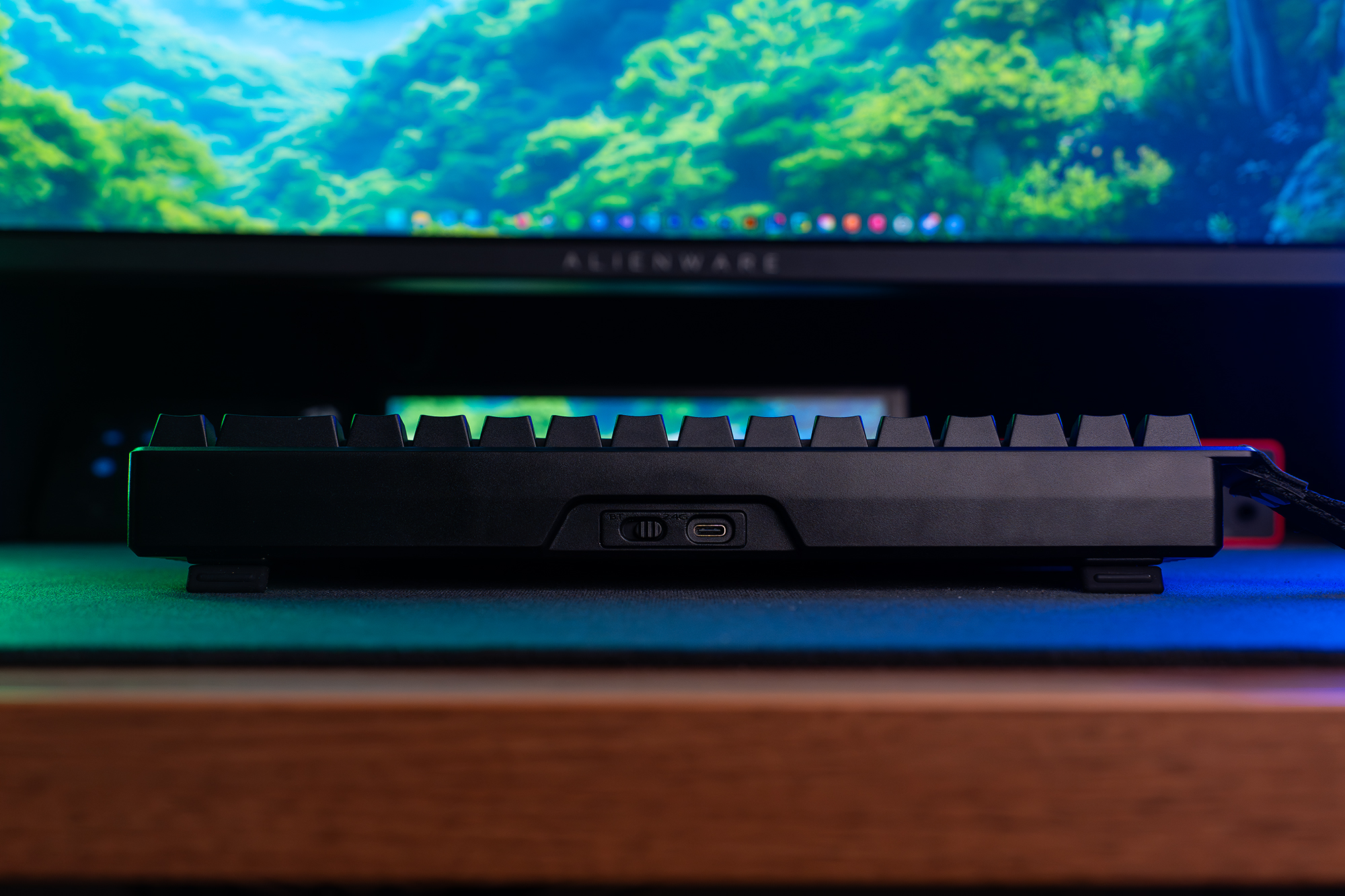 Sylwetka klawiatury z profilu przypomina trapez, wzbogacony o interesujące, geometryczne nacięcia na bocznych ściankach. Obudowa charakteryzuje się dość agresywnym nachyleniem, co osobiście uważam za dużą zaletę, a dla osób preferujących jeszcze większy skos, producent przewidział rozkładane nóżki na spodzie. Z kolei zaplecze funkcjonalne ulokowano z tyłu – znajdziemy tam port USB-C oraz przełącznik odpowiedzialny za wybór trybu łączności.