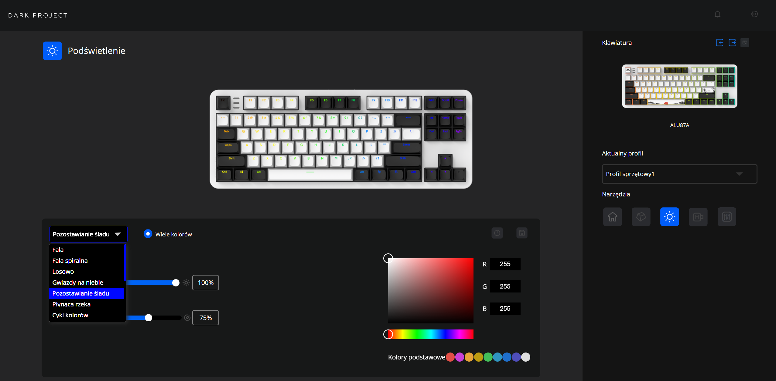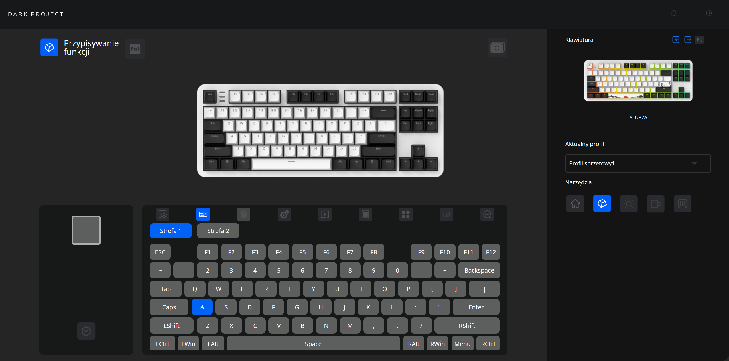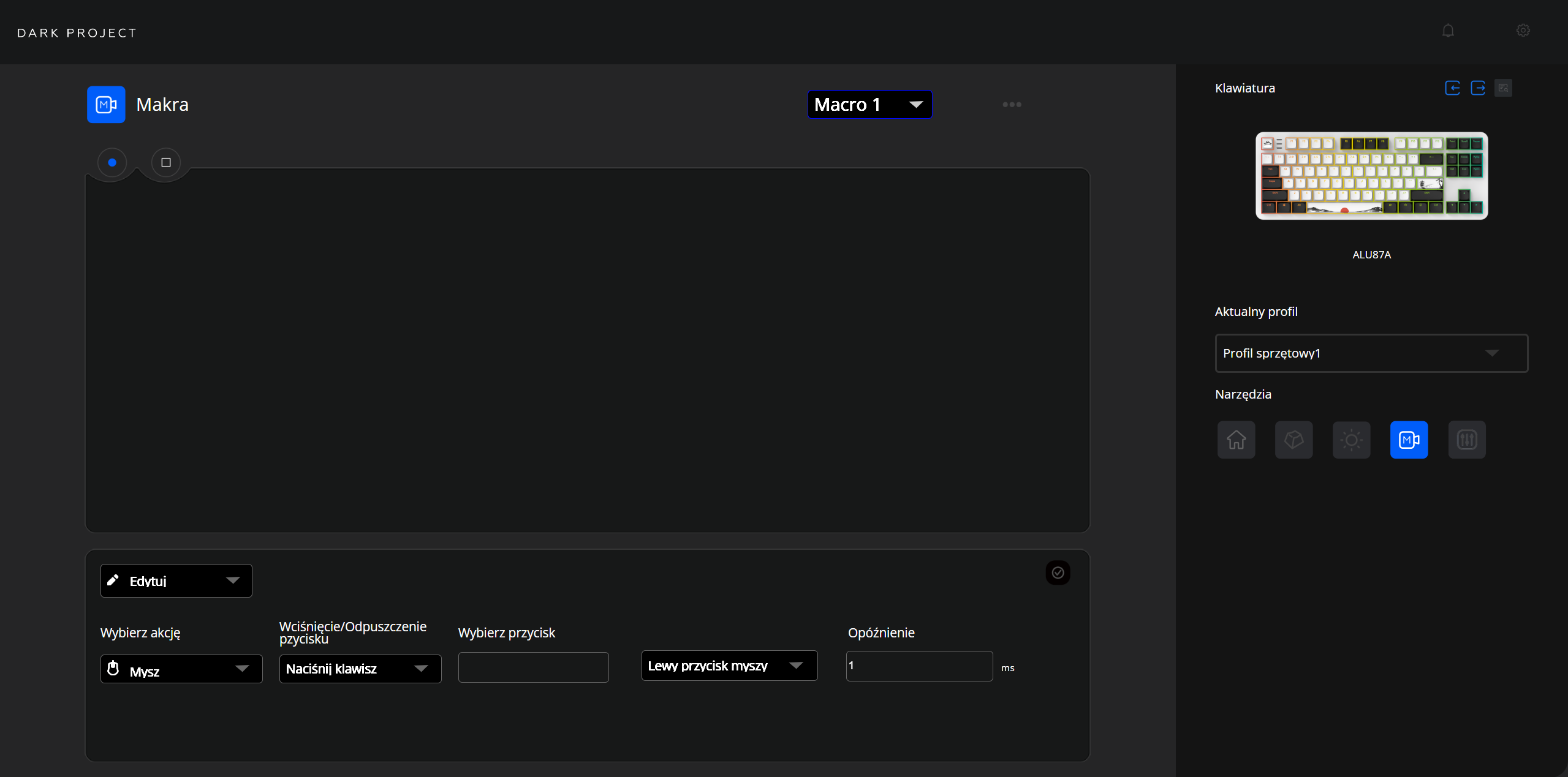 Czymże byłaby taka klawiatura bez oprogramowania? Dla Dark Project Fuji II producent przygotował webowy konfigurator, który dostępny jest z poziomu przeglądarki na stronie (link). Dzięki takiemu zabiegowi nie musimy specjalnie niczego pobierać na nasz komputer, co po prostu poprawia wygodę. W oprogramowaniu standardowo możemy zarządzać makrami, podświetleniem, przypisywaniem klawiszy oraz tak zwanym Snap Tap. Interfejs całościowo jest przejrzysty i przyjazny dla doświadczeń użytkownika.