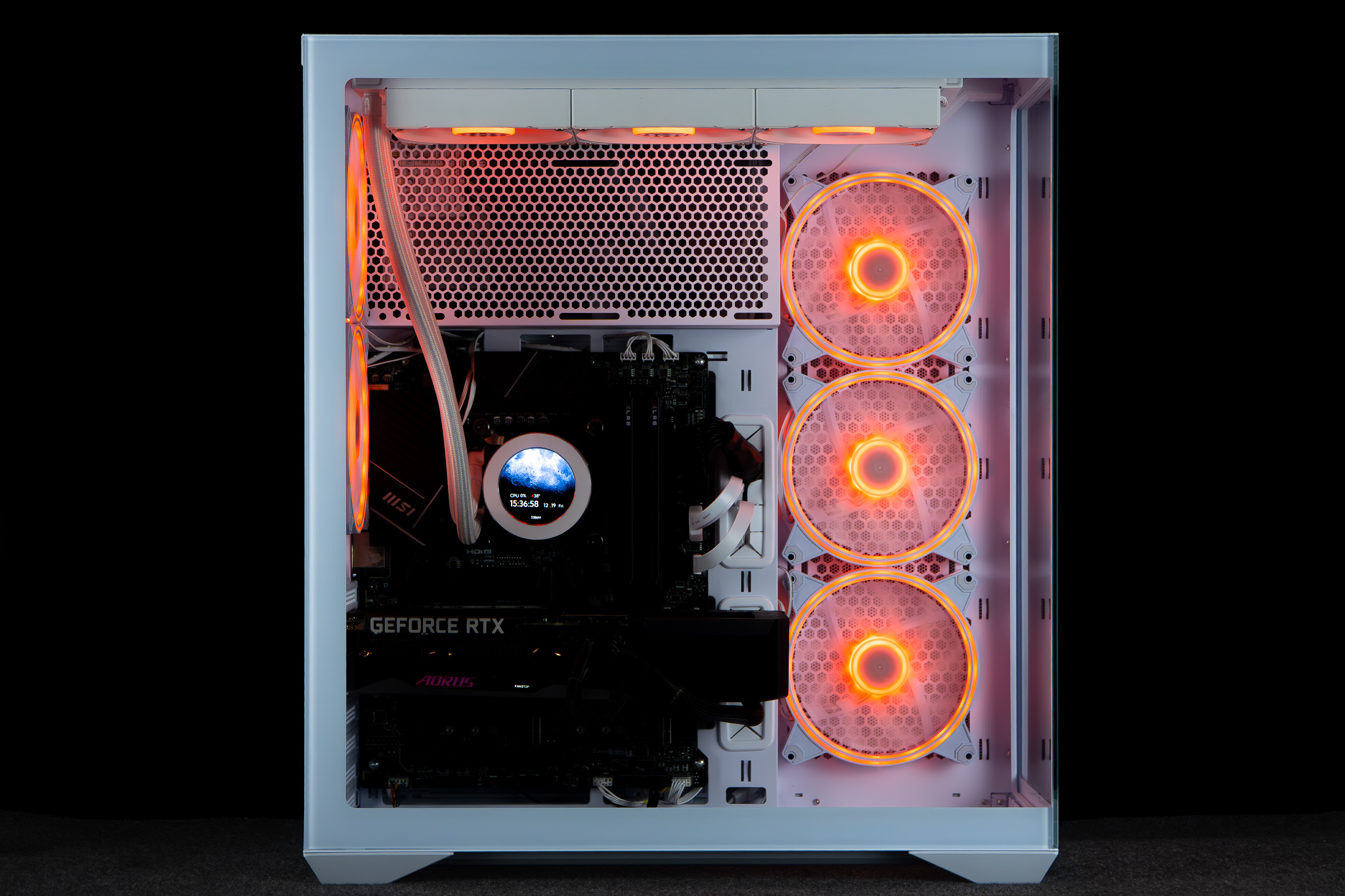 • CPU: Tutaj temperatury były w normie dla zastosowanego AIO. Górny panel mesh pozwala swobodnie wyrzucać ciepłe powietrze na zewnątrz, a dwa tylne wentylatory 140 mm skutecznie “czyszczą” okolicę sekcji zasilania VRM z gorącego powietrza. Wynik wydaje się typowy dla konstrukcji akwariowych.